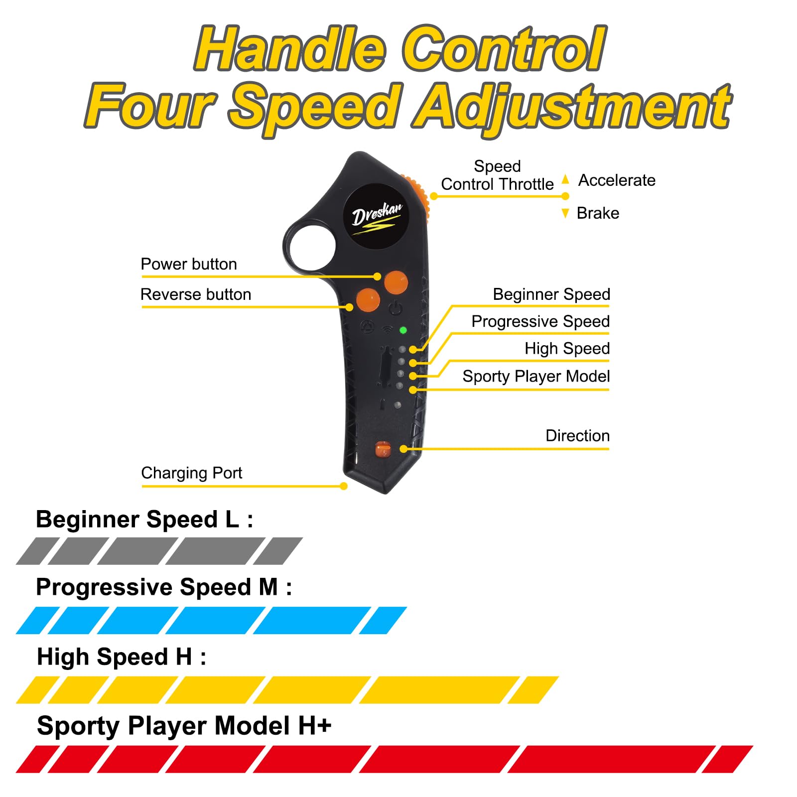 - 【Multifunction Wireless Remote】Equipped with 2.4G wireless remote control, small and good grip, Dreskar FT005 electric skateboards for adults is free to accelerate, brake, forward and backward, switch in 4 speed modes with instructions that can be read at a glance.Low,medium(8.7mph),high(13.67mph) and sporty palyer model(fastest start-up speed).